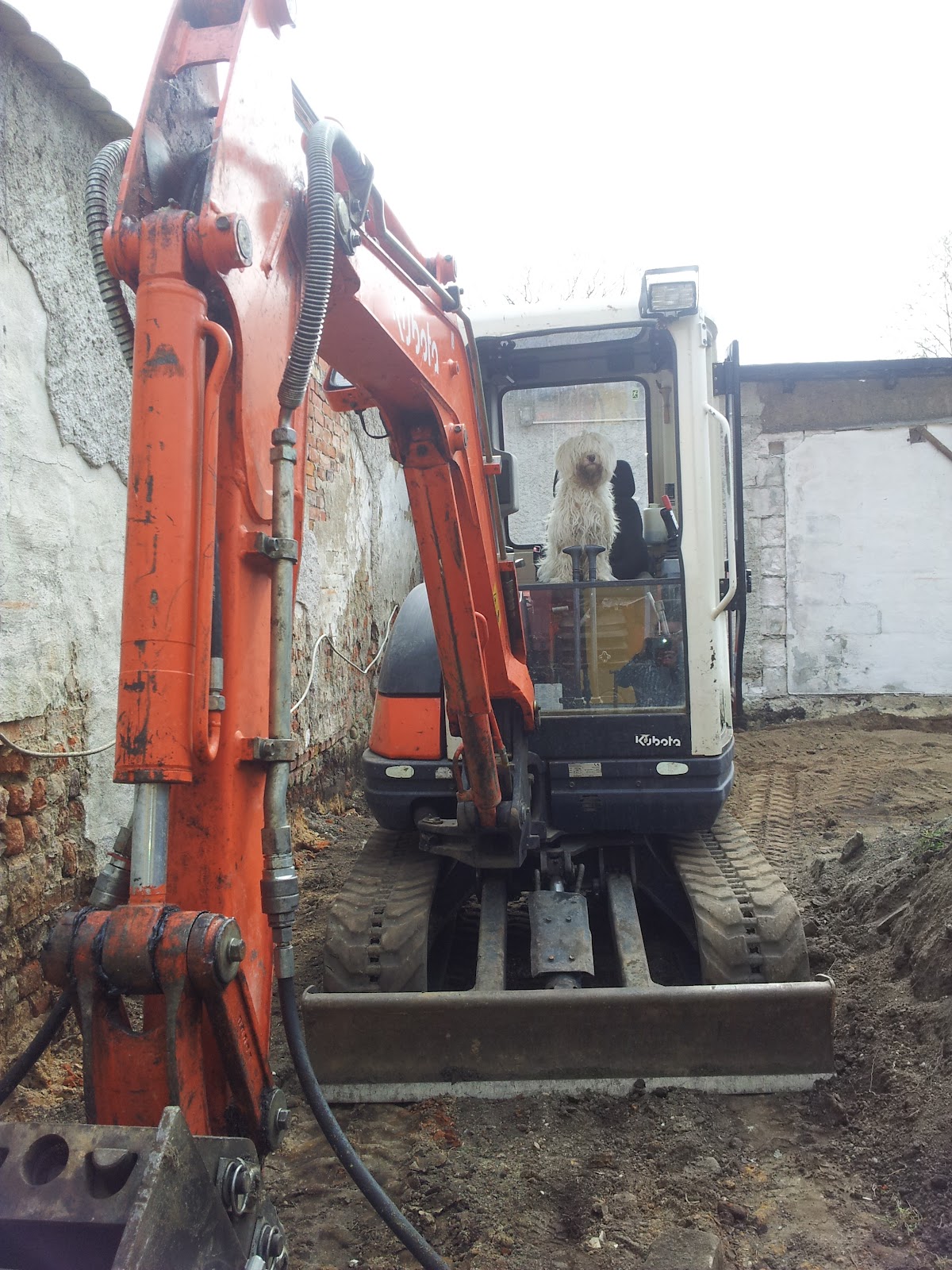 (Unser Tibetterrier Chamandi im Bagger. Sie ist immer mittendrin, um zu helfen.)