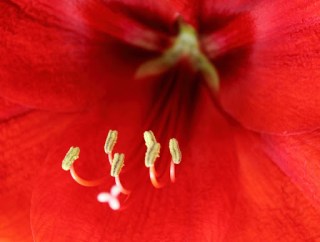 Fangen wir mal krachend-rot an. Die Amaryllis blüht in vier riesengroßen Blüten.
