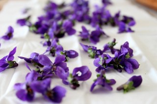 Veilchen sammeln und auf eine durchlässige Unterlage betten.
