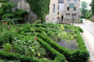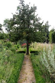 Die Zufahrt zum Schloss säumt links ein formales Buchsbaumparterre, ausgefüllt mit Kräutern und Blühpflanzen, und rechts an der Mauer wächst es recht bäuerlich vor sich hin, z. B. mit Malven.