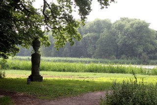 Die Reide-Aue ist Teil des Landschaftsparks und so überquert der Besucher immer wieder kleine Brücken. In der Ferne leert Flora ihr Füllhorn aus.