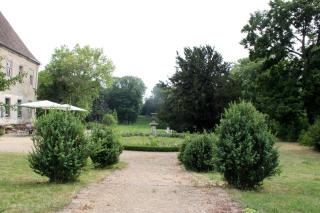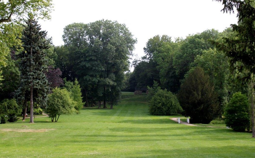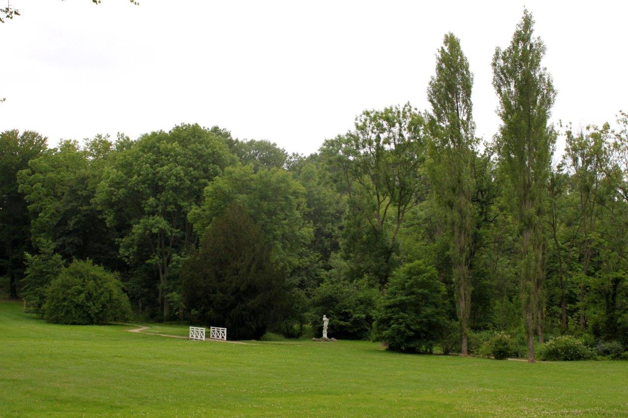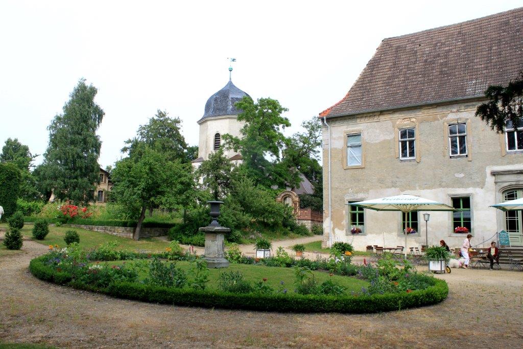 Geht man um das Schloss herum, eröffnet sich alsbald die wirklich beeindruckende Blickachse, die von der ruinösen Orangerie über ein rundes barockes Buchsbaumparterre und über die Rasenfläche bis zu alten Baumriesen und dem rekonstruierten Fundament des Teehauses reicht.