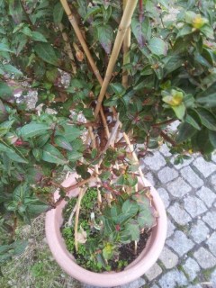 2. Das Stämmchen ist ganz empfindlich und als bei uns kürzlich ein kräftiger Sturm über das Land fegte, haben wir befürchtet, dass das die Fuchsie nicht übersteht. Also – schnell die Stäbe eingefädelt und alles war gut 🙂