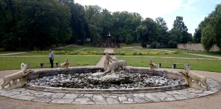 Vor der Orangerie befindet sich der Hirschbrunnen mit Jagdmotiven. Unser Hund Chamandi war durch die vier Jagdhunde irritiert, obwohl sie doch von den steinernen Kollegen nichts zu befürchten hatte 😉