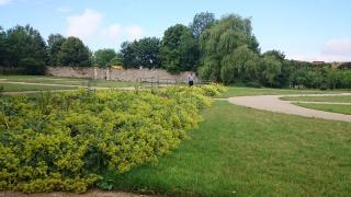 Insgesamt 18 Höhenmeter werden mit der Gartenanlage überwunden. Oben seht Ihr das Rasenparterre, im Hintergrund die Orangerie, auf die der Schlosspark ausgerichtet ist. Unten seht Ihr die Rabatte aus Frauenmantel, die einen kleinen Wasserlauf versteckt.