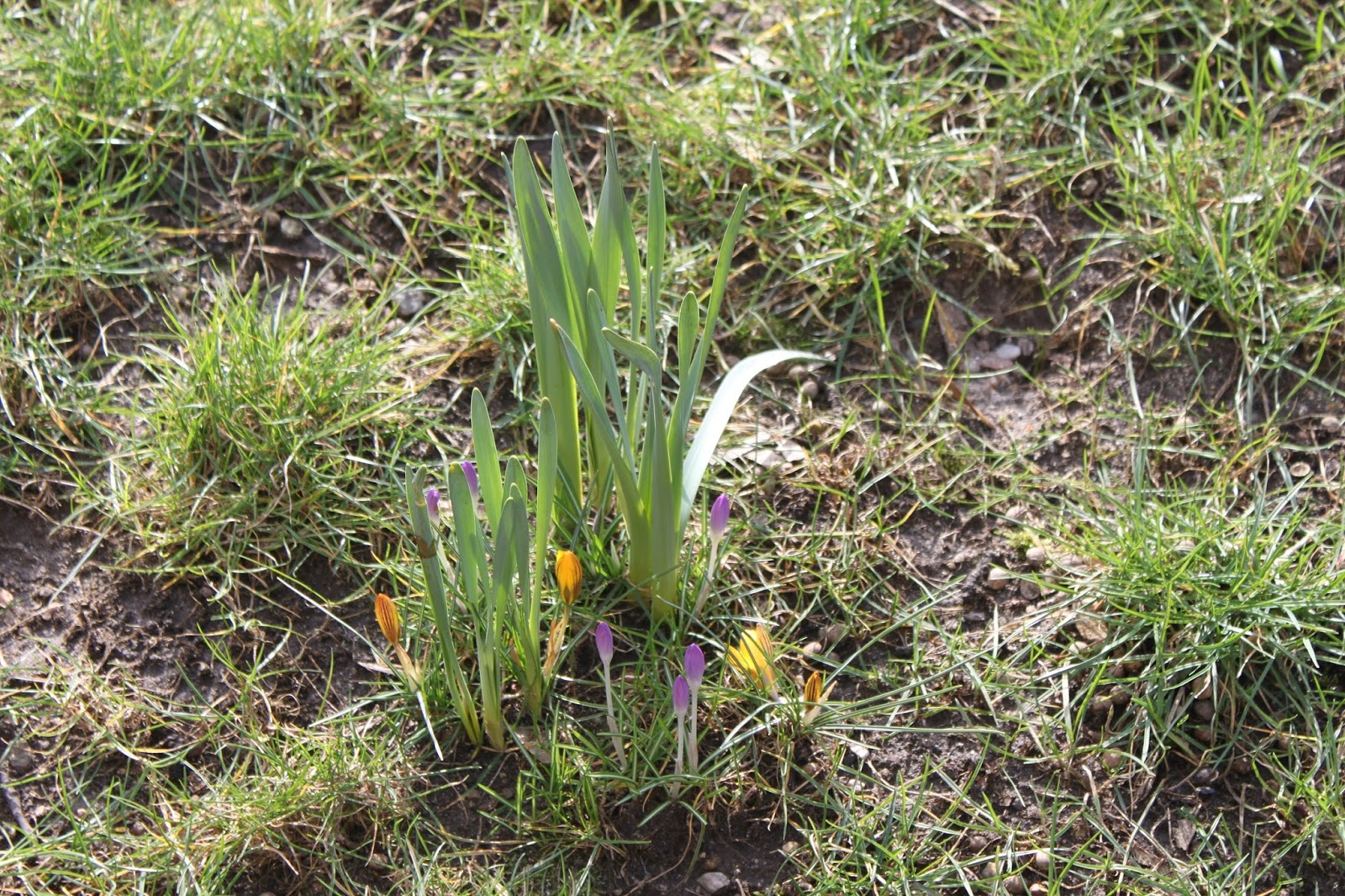 … und auf der ramponierten Wiese stehen Krokusse einträchtig neben den großen Narzissen.