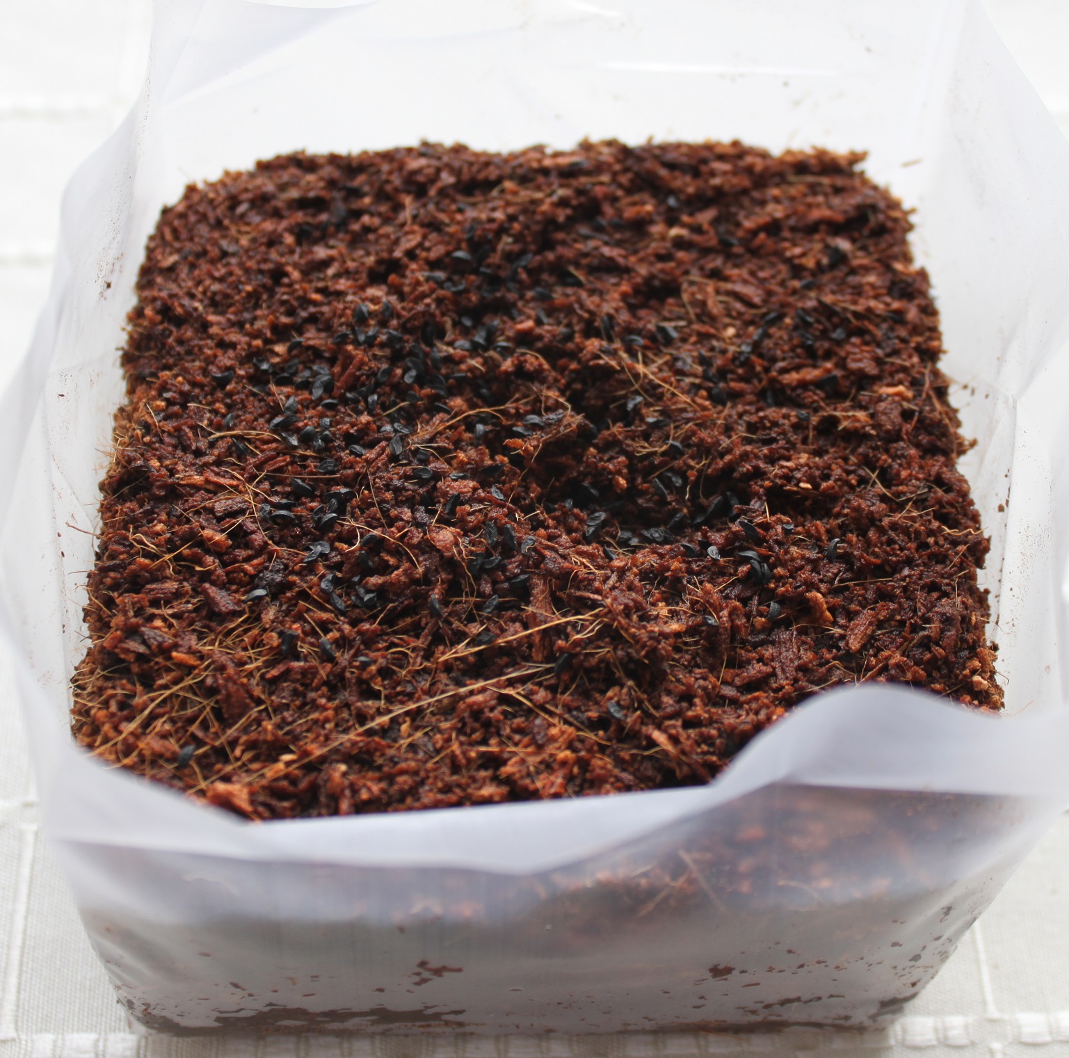 Jedes Anzuchtset enthält einen auffaltbaren Kunststoffbehälter mit Kokosfaserplatte, ein Samentütchen und eine Aussaatanleitung. Darin ist alles sehr gut erklärt. Der Kunststoffbehälter ist aus ökologischen Gesichtspunkten natürlich fraglich, aber er ist wasserdicht und Ihr werdet gleich sehen, warum das nötig ist.