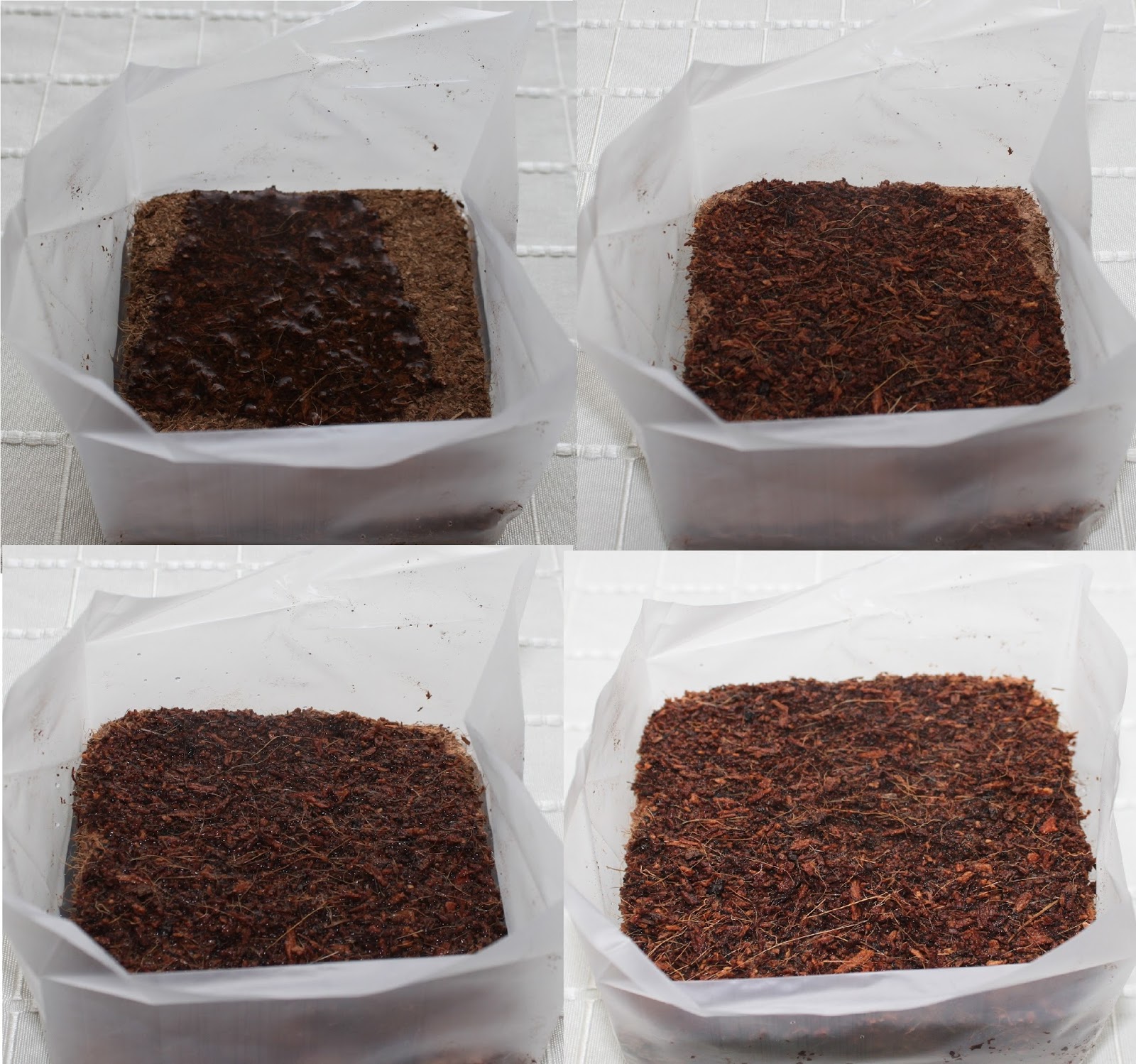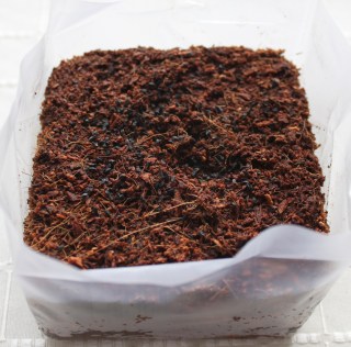 Auf die Kokosfaserplatte kommen 350 ml Wasser und hier beginnt der erste Spaß, nämlich zu sehen, wie die Platte aufquillt.