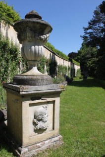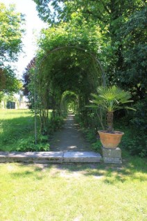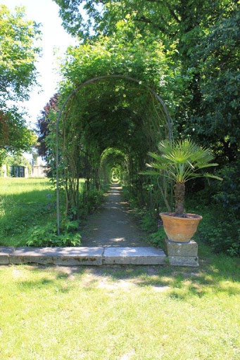 Eigentlich nutzlos und trotzdem pittoresk ist die Exedra, ein steinerner Pavillon, von dem aus sechs Wege abgehen, zwei davon als Laubengang mit Wisteria (Gold- oder Blauregen) gestaltet. An einer Seitenachse befindet sich das Haus des Gärtners, in dem Ausstellungen gezeigt werden.