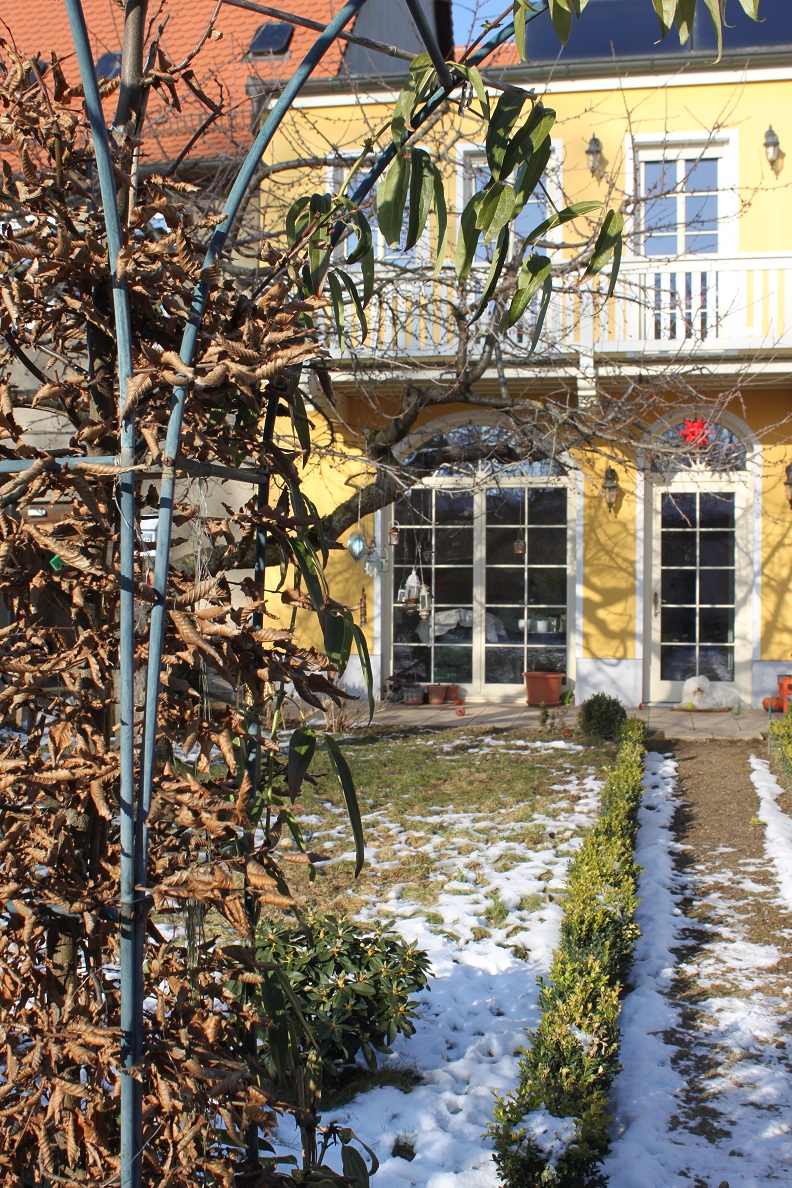Die neue Gartenbewohnerin fühlt sich offensichtlich wohl bei uns. In den ersten Monaten bezauberte sie mit ihren filigranen, duftenden Blüten und wuchs schnell bis an das obere Ende des Hainbuchen-Pavillons. Mal schauen, wie es in diesem Jahr weitergeht. In diesem Winter ist sie zumindest einer der Stars im Fuchs-Garten 🙂