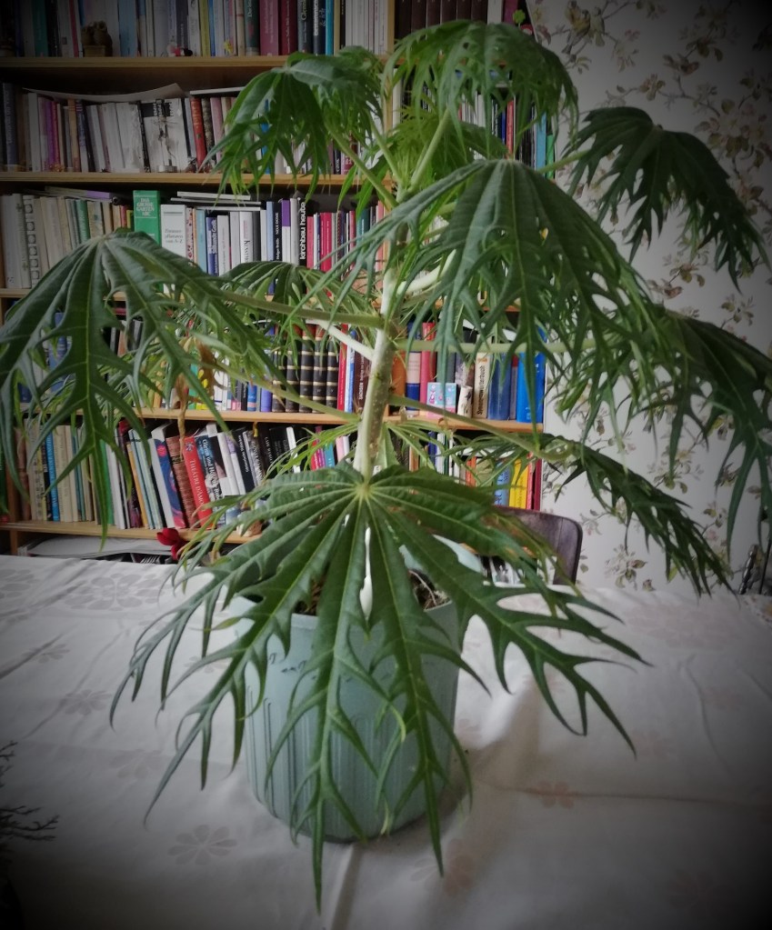 Auf dem Süden der Erdkugel heimisch ist die Jatropha multifida, der Korallenbaum. Wir haben sie für rund 17 Euro vor einem knappen Jahr beim örtlichen Pflanzenhändler erworben. Damals blühte sie mit dekorativen kleinen, orangefarbenen Blüten. Zwar blieben die nicht lange so, doch die Pflanze ist auch nur mit dem Laub äußerst dekorativ, wie Ihr seht. Ich empfinde sie als Pflegeleicht, nur darf sie nicht zu sehr austrocknen. Wie bei den meisten Zimmerpflanzen überprüfe ich auch bei der Jatropha einfach durch Anheben, wie schwer oder leicht sich der Topf anfühlt und entscheide danach die Menge der Wassergabe. Für Neulinge erscheint das vielleicht schwer, probiert es einfach aus. Die Jatropha steht bei uns hell, allerdings nicht in der direkten Sonne.