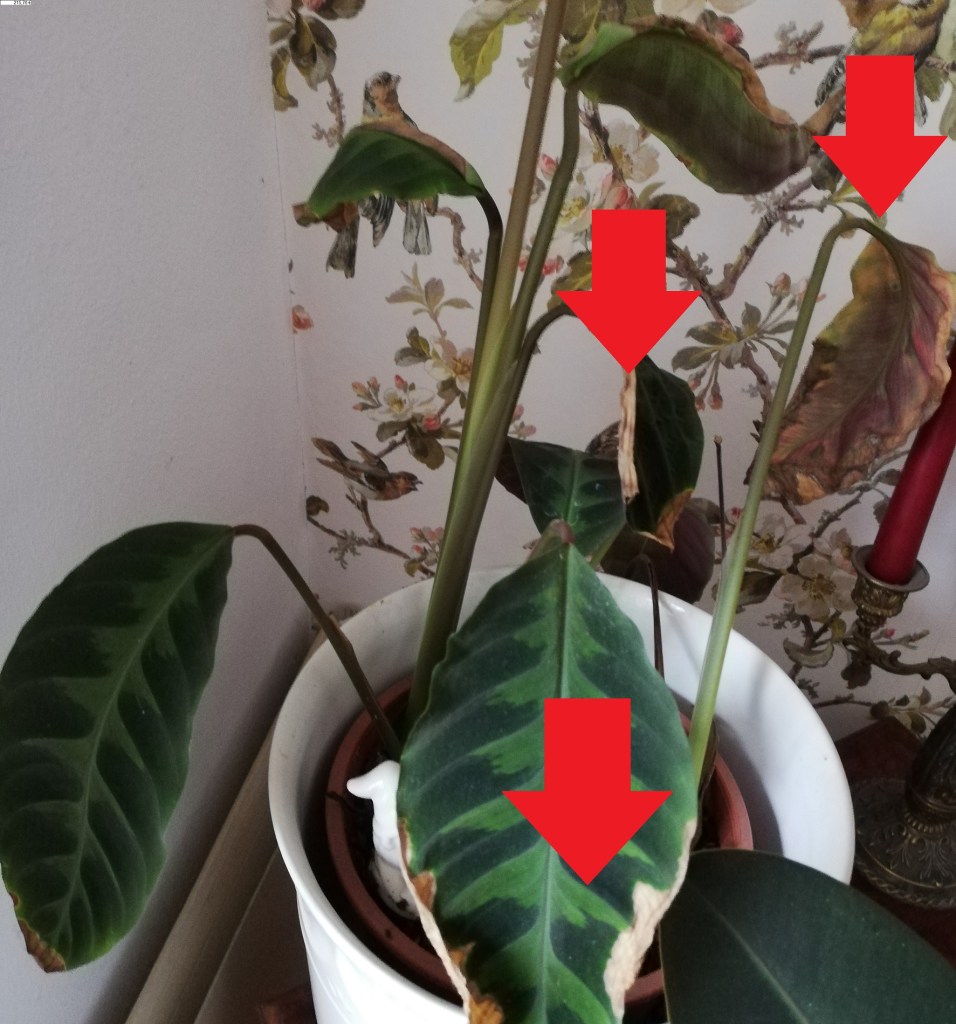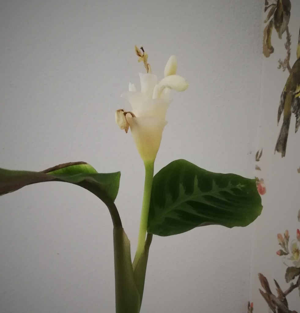 Auf dem linken Bild seht Ihr sehr gut eine häufige Erscheinung an der Korbmaranthe. Diese braunen Blattränder deuten auf zu niedrige Luftfeuchtigkeit. Für derartige Exoten benötigen wir eigentlich einen Extraraum. Online las ich kürzlich von jemandem, der seine Maranthen mit dem Tauchsieder regelrecht bedampft. Natürlich muss man aufpassen, sie nicht zu verbrühen, aber über eine solche Bedampfung mittels Wasserkocher habe ich dann auch schon mal nachgedacht. Die Calathea darf nicht zu sehr austrocknen, allerdings mag sie ebenfalls keine Staunässe. Sie ist also eine kleine Diva, trotzdem möchte ich sie bei uns nicht missen und über diese erste Blüte habe ich mich wie Bolle gefreut!
