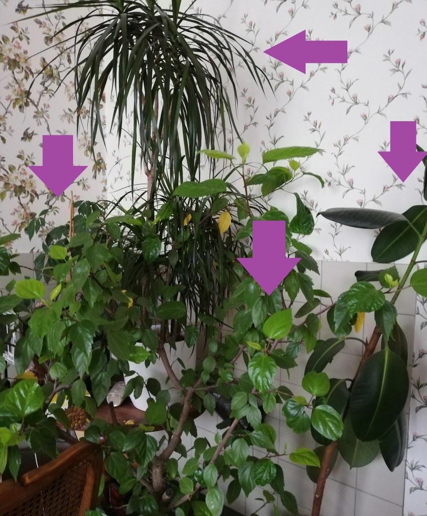 Zum Glück haben wir auch Platz für große Pflanzen, von denen die meisten im kühleren Halbjahr in einer hinteren Zimmerecke stehen, also nur indirektes Licht bekommen. Der Hibiskus (chinesischer Roseneibisch) ist ein Geschenk der lieben Sylvia und er darf im Sommer auf die Terasse, allerdings nur in den lichten Schatten des Kirschbaums. Im Winter zeigt er umgehend mit gelben Blättern, wenn ihm etwas nicht passt – meist fehlt Wasser. Den Drachenbaum hat uns die liebe Mutter des Gatten vermacht, weil angeblich ihre Katze dran genagt und sich damit den Magen verdorben hat. Auch der große Gummibaum ist ein Geschenk und zwar vom herzigen Stefan und seinen Eltern, die ein uraltes Exemplar des Ficus‘ besitzen und davon regelmäßig absenkern. Angeblich sind ja eh‘ die geschenkten Senker die Pflanzen mit den besten Überlebenschancen. Merkt Euch: Man darf sich nie für geschenkte Pflanzen, sonst wachsen sie nicht an oder gehen ein.
