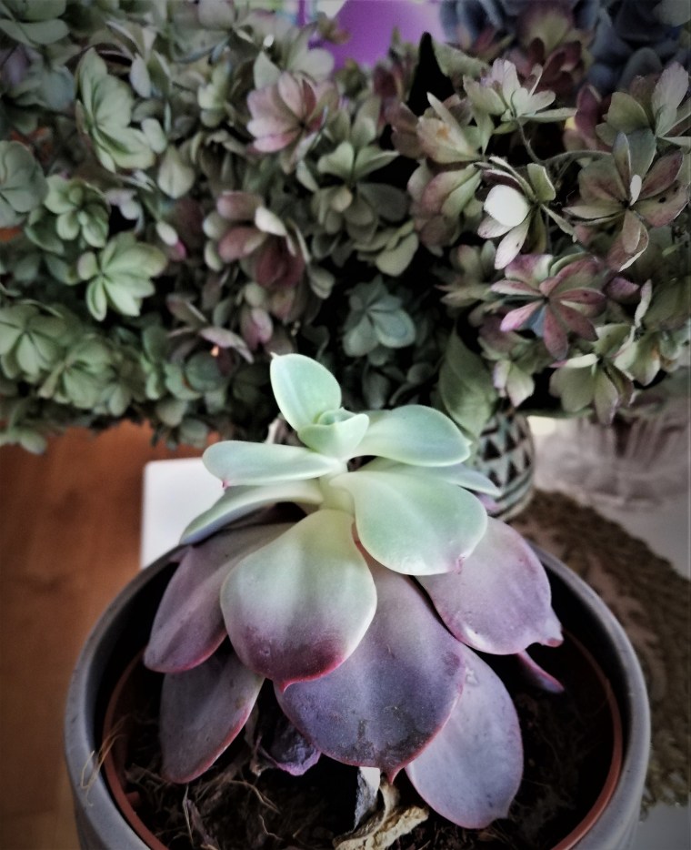 Zugegeben – dieses kleine Gewächs, das hier so farblich passend vor den getrockneten Hortensienblüten steht, habe ich beim Discounter erworben. Bis in den November hinein wuchs es friedlich in einer kleinen Ecke auf unserer Terasse vor sich hin, um dann vor der Kälte ins Wohnzimmer gerettet zu werden. Anfangs bildeten die Blätter eine flachgedrückte Halbkugel über der Erde, da jedoch mittlerweile die unteren Blätter vertrocknet waren und entfernt werden mussten, verkahlt der Stamm von unten. Bin mal gespannt, wie es mit der Kleinen weitergeht.