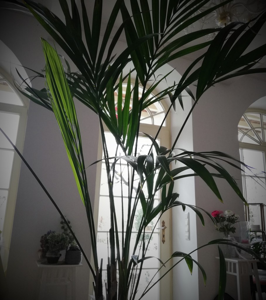 Unsere bisher „teuerste“ Zimmerpflanze – eine Kentia-Palme. Die Ausgabe von rund 25 Euro für das ursprünglich in Australien wachsende Grün hat sich allerdings gelohnt. Sie wächst unermüdlich und ist eigentlich pflegeleicht, denn außer einer regelmäßigen Wassergabe benötigt sie kaum Zuwendung. Da die Spitzen neuer Blattwedel oft auch ausgewachsen zusammenhängen, spiele ich immer mal Sturm und rüttele ein bisschen, bis sich die Spitzen voneinander lösen. Aller paar Wochen muss mal ein brauner Wedel abgeschnitten werden und das war es dann auch schon.