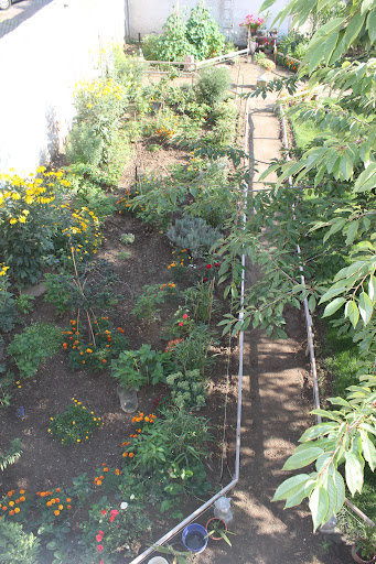 Das vordere rechte Quartier wird von unserem herrlichen Kirschbaum bestimmt. Den lieben wir heiß und innig, weil er Schatten und leckerste Kirschen spendet.