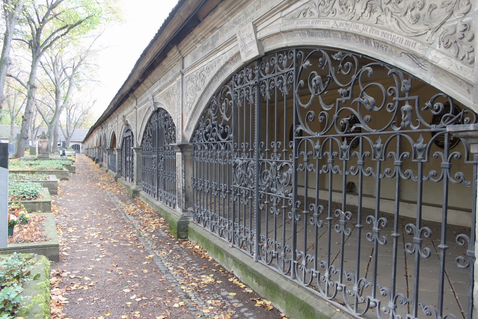 Als das Navi das Erreichen des Ziels verkündet, können wir das erst kaum glauben, denn unüberwindbar hohe Mauern umgeben den Stadtgottesacker vor Halle und verbergen ihn vor den Blicken des Vorbeihastenden. Hinter diesen Mauern sind Arkaden angebaut, in denen die Grüfte bekannter Hallescher Persönlichkeit liegen, wie vom Gründer der Frankeschen Stiftungen August Hermann Francke und dem Historiker Johann Christoph von Dreyhaupt.